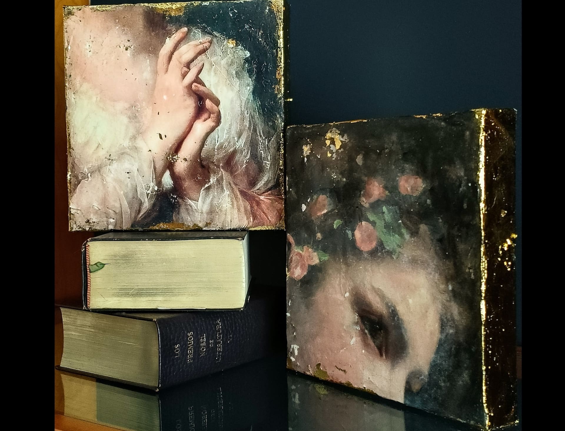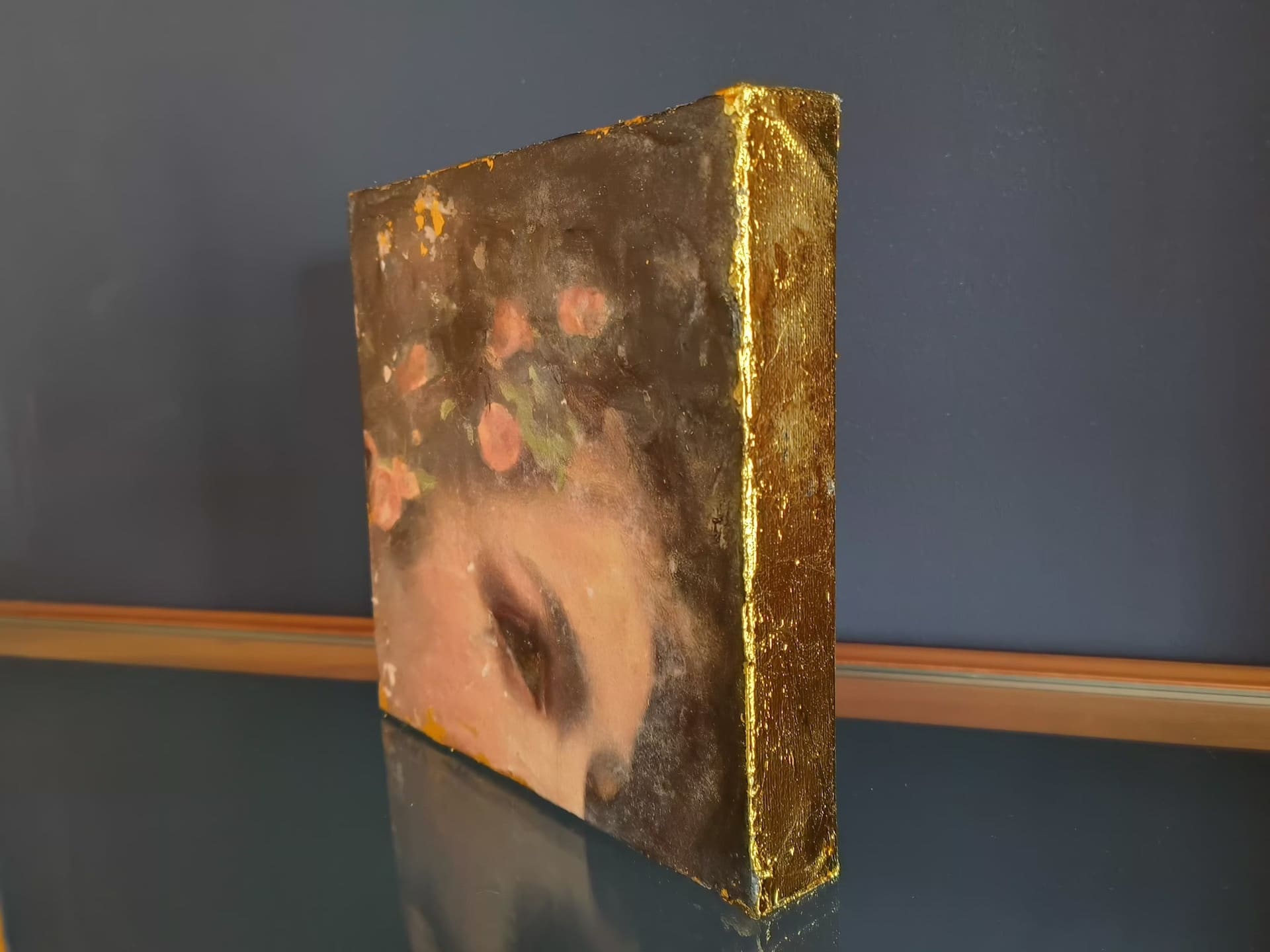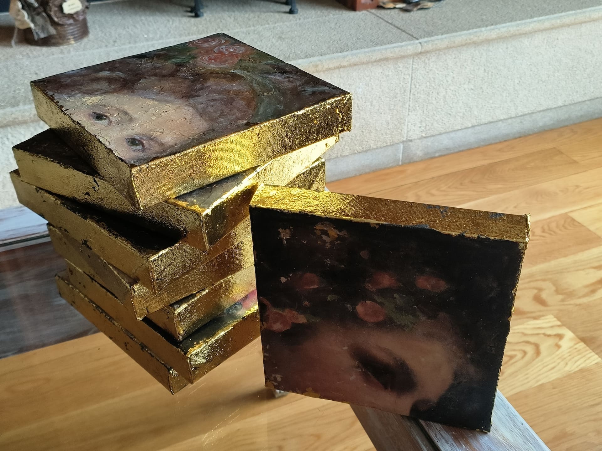 El toque final que hace que estas obras destaquen y sean tan especiales es la aplicación de pan de oro en los laterales de los pequeños lienzos. Esta técnica añade una dimensión adicional de lujo y esplendor a cada cuadro, realzando la belleza y la elegancia de la pieza.