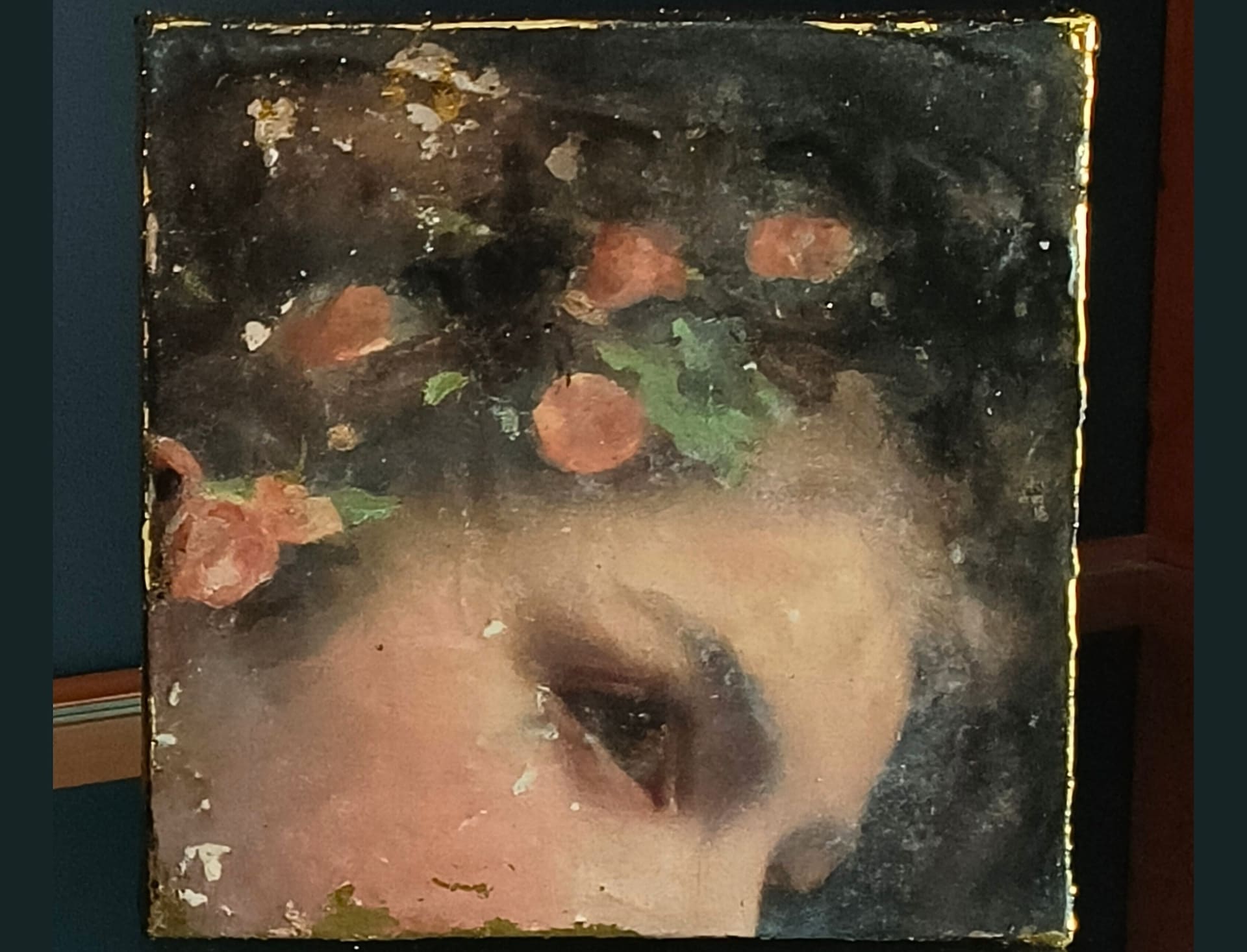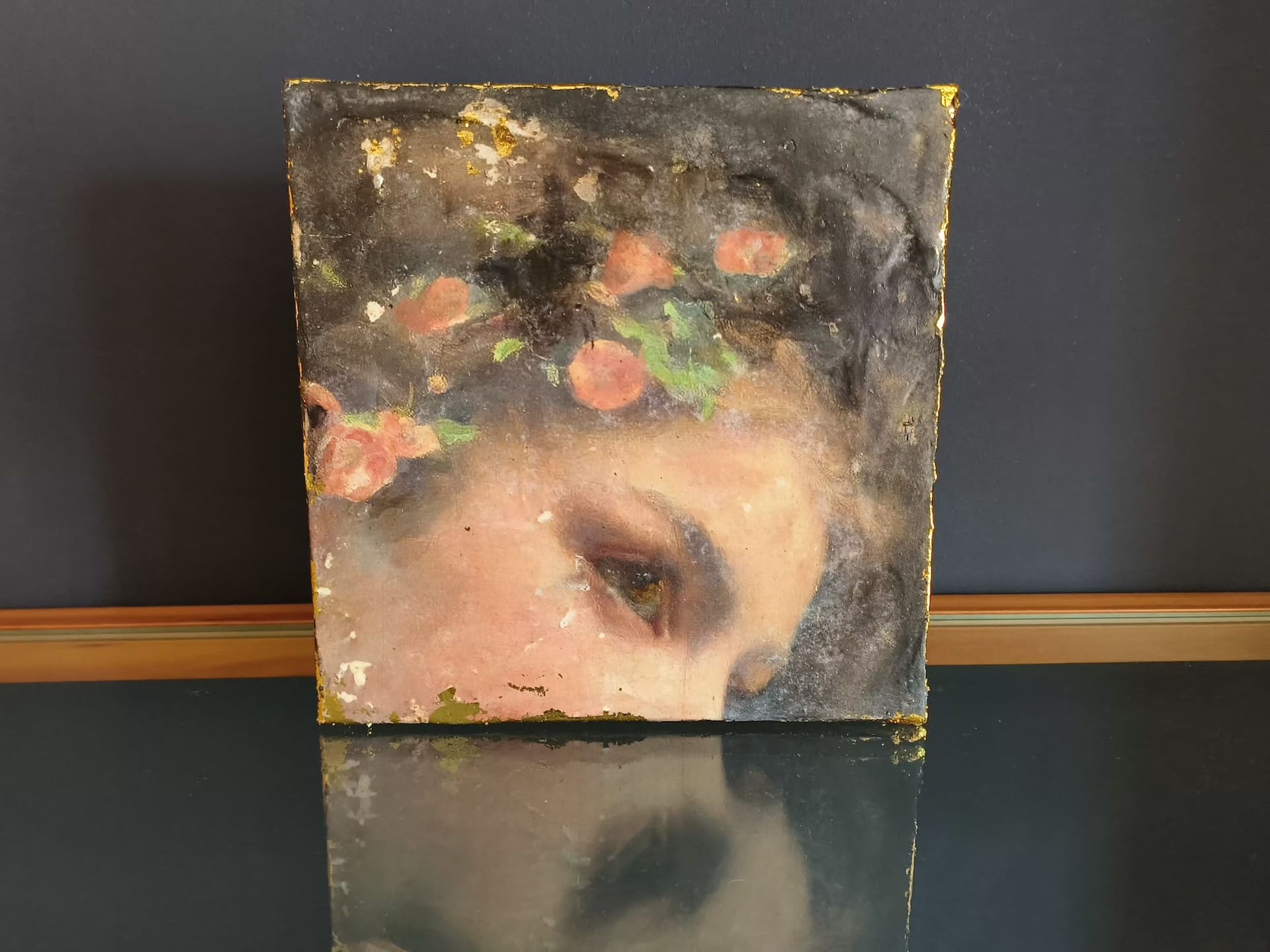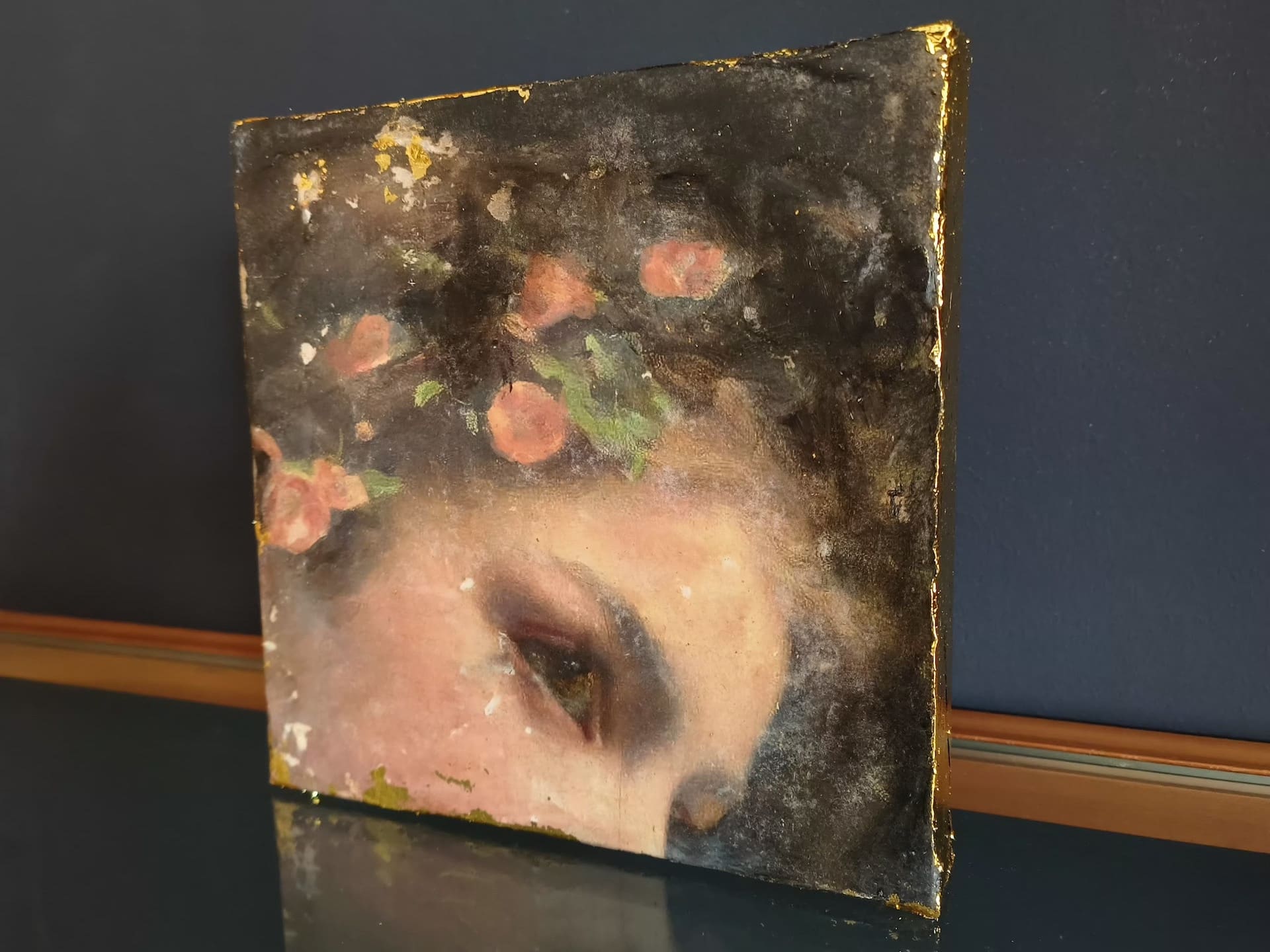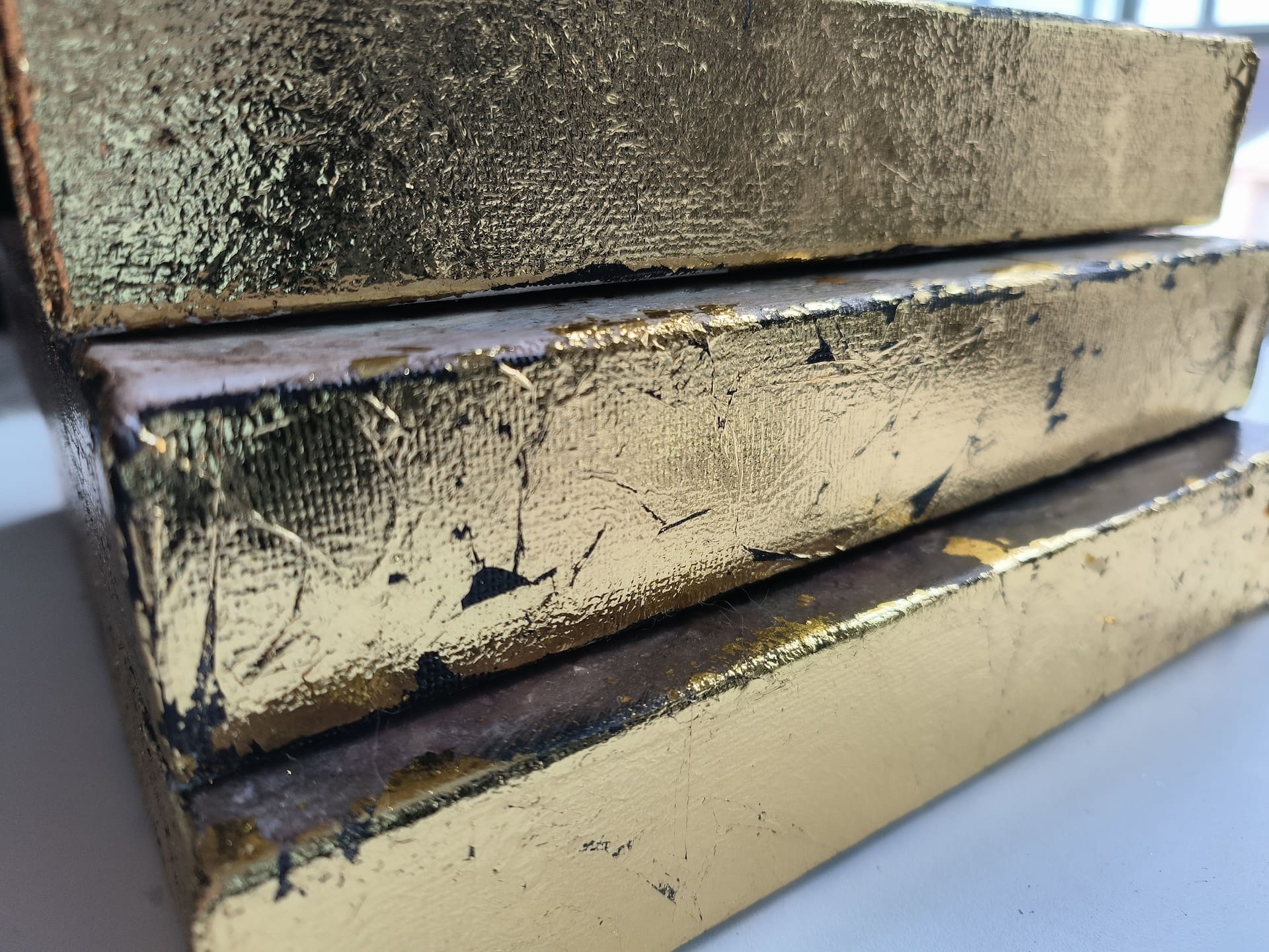 El toque final que hace que estas obras destaquen y sean tan especiales es la aplicación de pan de oro en los laterales de los pequeños lienzos. Esta técnica añade una dimensión adicional de lujo y esplendor a cada cuadro, realzando la belleza y la elegancia de la pieza.