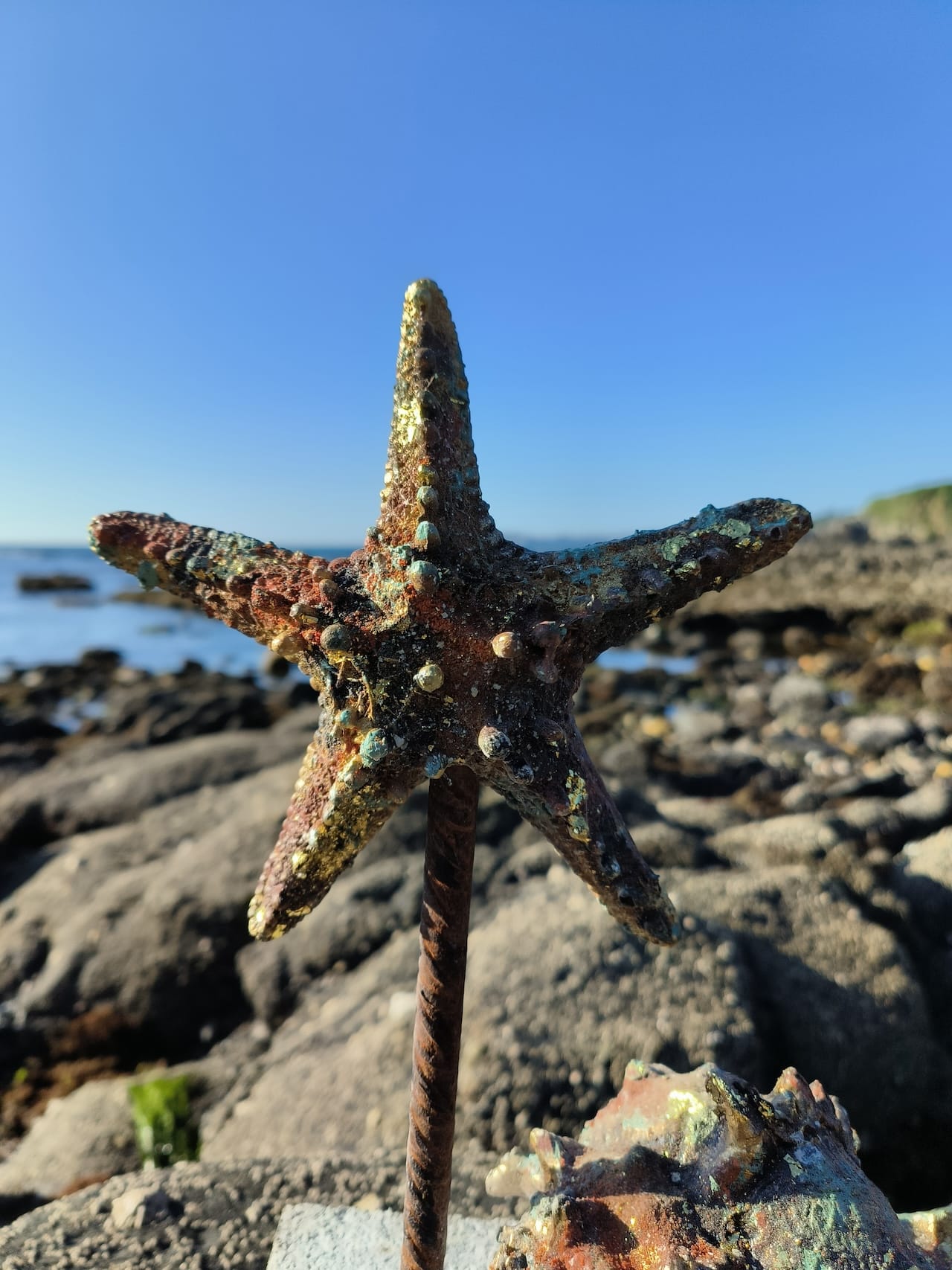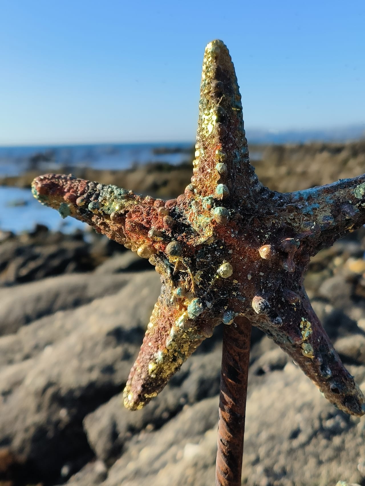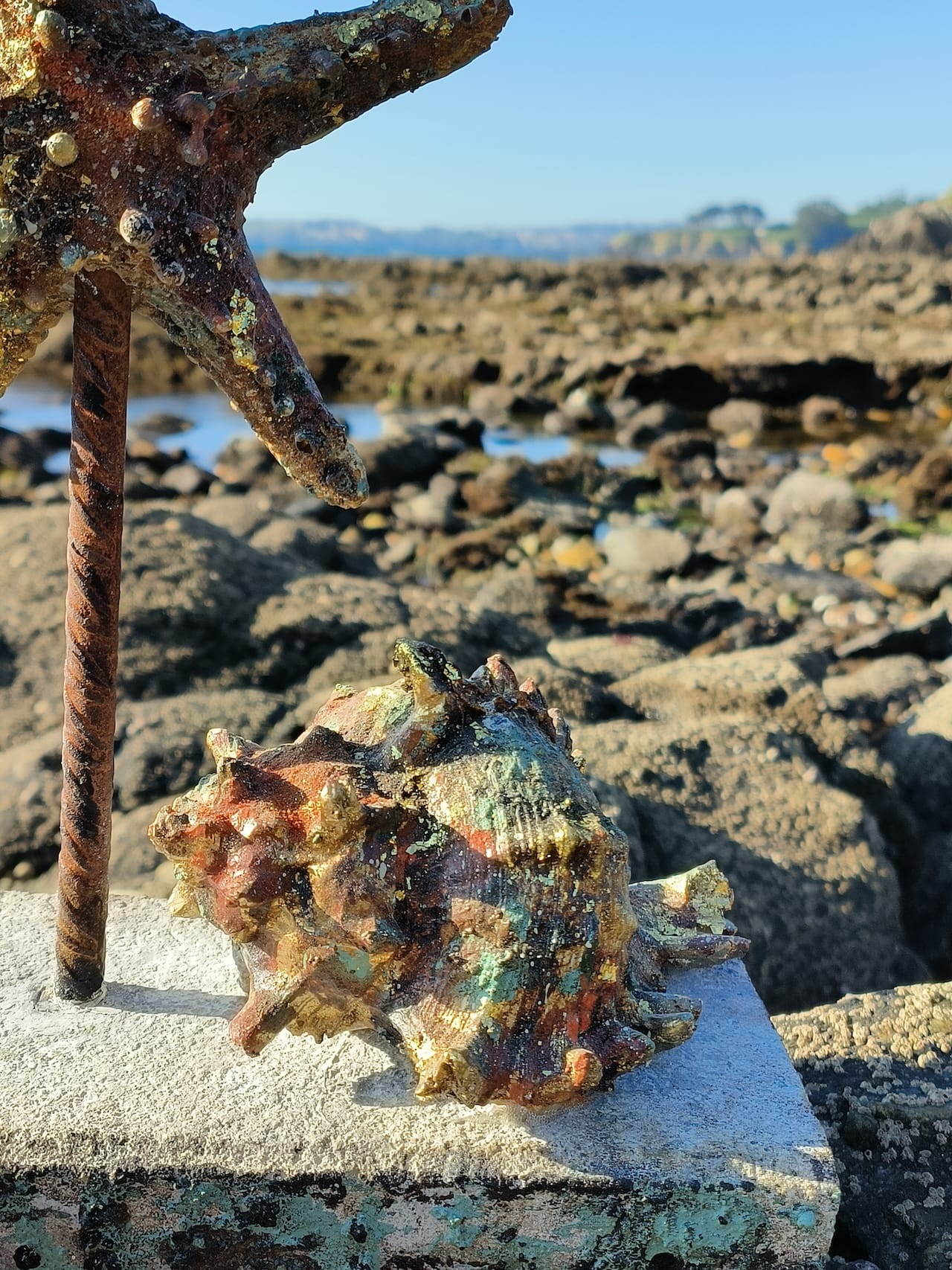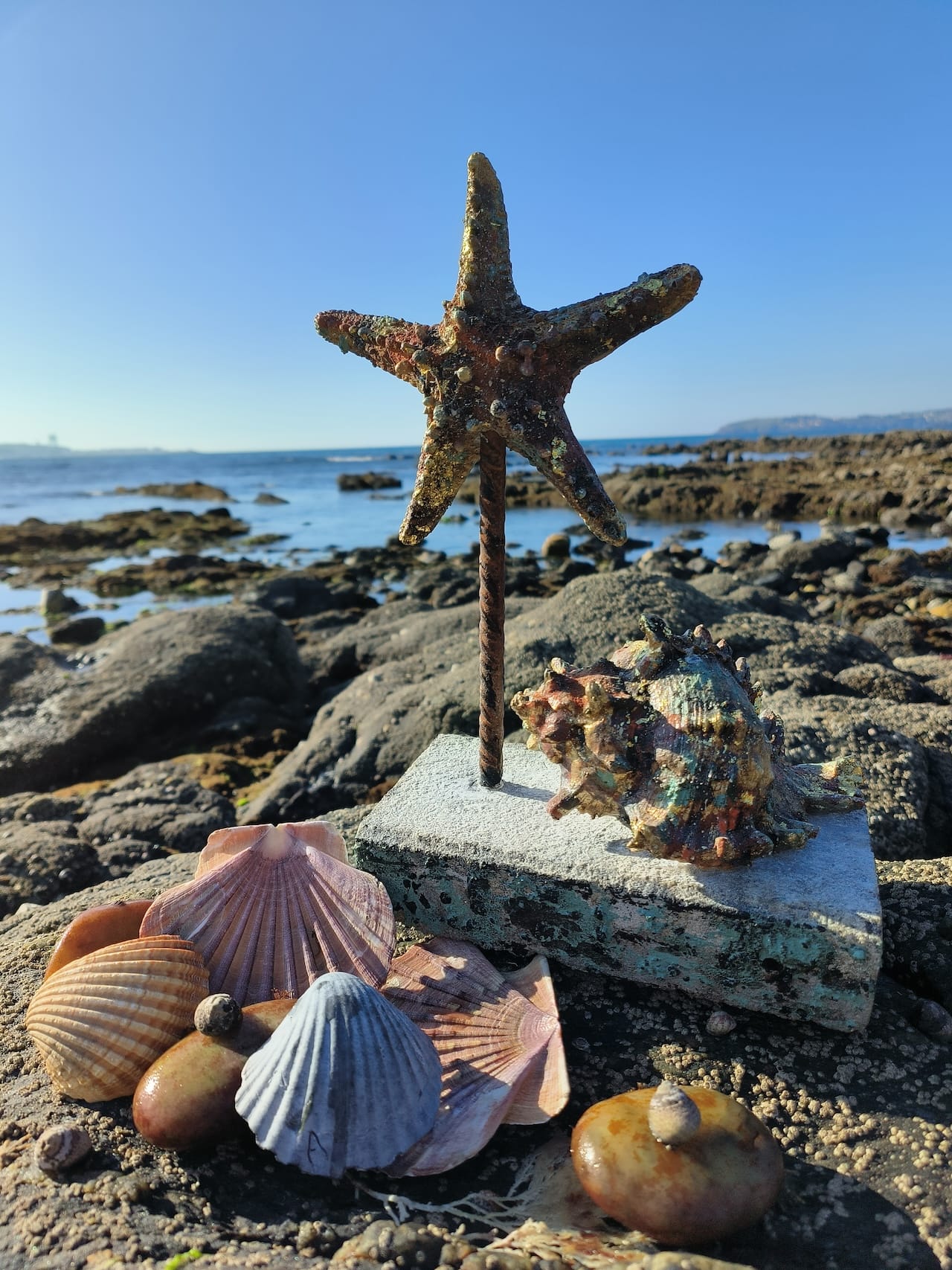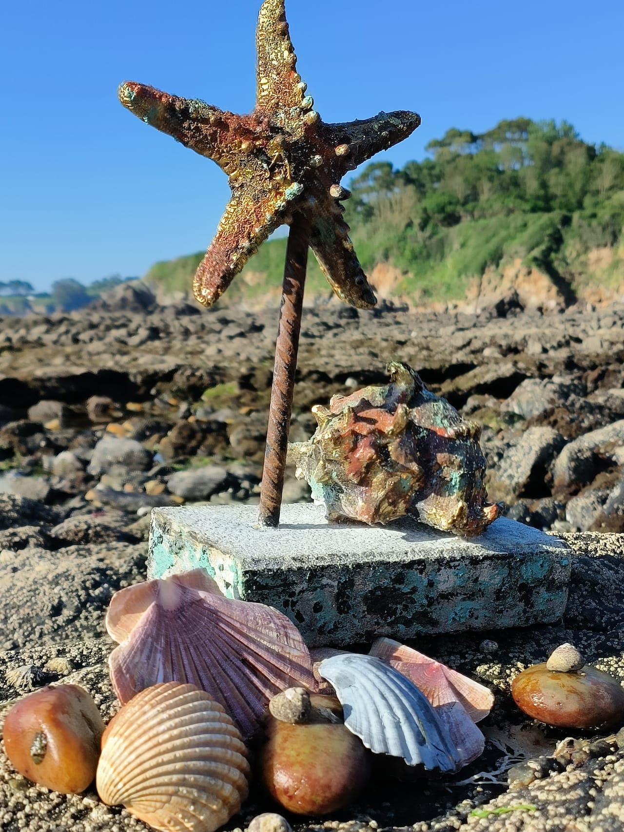 Una preciosa estrella de mar ⭐ y una bonita caracola 🐚se unen, ambas realzadas con técnicas de texturas que le aportan capas entremezcladas en tonos turquesas y óxidos, el brillo del dorado a la hoja que parece reflejar los cálidos atardeceres y los sepias que dan ese aspecto tan vintage que me apasiona!